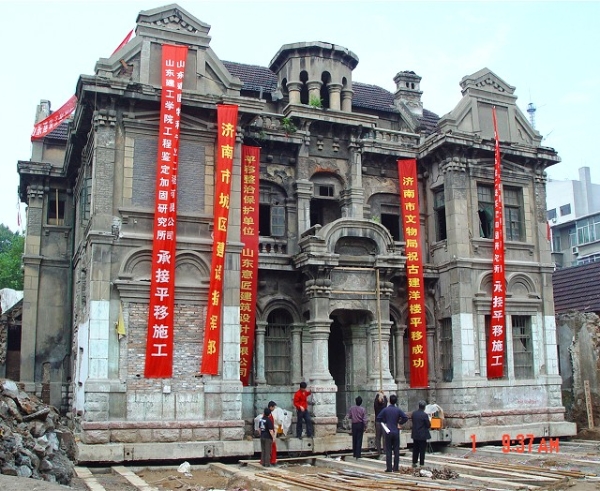 山東豐大銀行舊址 位于濟(jì)緯六路27號(hào)。始建于1919年,坐西面東,占地面積600平方米,前后兩座建筑,沿街主體建筑為營(yíng)業(yè)、辦公等,磚石木結(jié)構(gòu)大瓦頂,東西深12.6米,南北闊 23.3 米,建筑面積454平方米,主體兩層,局部三層( 抬高的閣樓層)。平面呈“ 凹” 字形,在凹進(jìn)去的中間部分又突出一個(gè)單層的門(mén)廊。門(mén)廊兩側(cè)的一層是連續(xù)的半圓券柱廊,白色的圓柱。二層為扁平拱形窗口,窗上以有較復(fù)雜的線腳的檐口女兒墻作為東立面頂部的結(jié)束。屋頂為有弧線形老虎窗的紅瓦坡屋面。南、北、西幾個(gè)墻面的設(shè)計(jì)手法與東立面的手法相似,但略有所簡(jiǎn)化。該建筑裝飾的重點(diǎn)是東入口, 高大的石基座上立著兩根尺度超常的圓形白色石柱,柱子短而精,柱頭、柱基的線腳豐富而飽滿,充滿了張力 ;兩根柱子上頂著一個(gè)弧線形的山花 ;最上面是一個(gè)由八根短而粗的白圓柱頂著一個(gè)八角形的鐵皮屋頂組成的城堡式八角形塔樓。后附屬建筑為員工宿舍,磚石木結(jié)構(gòu), 磚石墻大瓦頂,東西深6.67米,南北闊15.7米,建筑面積200平方米,兩層有廊。該建筑在濟(jì)南近代建筑中,尤其是在歐式建筑較集中的商埠區(qū)里,裝飾手法最繁雜、豐富、華麗,是南部歐洲巴洛克建筑風(fēng)格在濟(jì)南的孤例。2005年緯六路拓寬改造工程中,將其整體向西平移約15米。