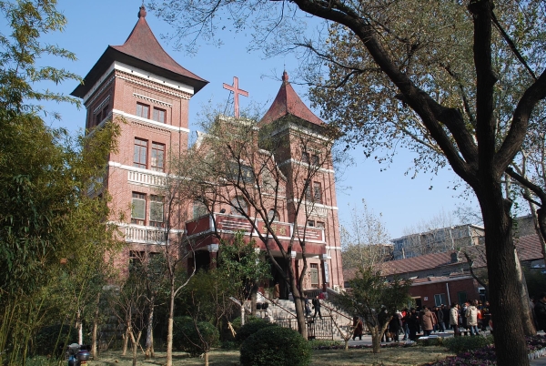 基督教自立會(huì)禮拜堂 位于經(jīng)四路425號(hào)。1924—1926年由李洪根設(shè)計(jì),長(zhǎng)老王宣忱主持建造。占地面積1.33萬(wàn)平方米,建有禮拜堂1座及樓房,平房300余間,附設(shè)進(jìn)德小學(xué)1所。禮拜堂主體建筑面積1763.4平方米,占地面積770平方米。磚石結(jié)構(gòu)地上兩層,地下一層,高度24米??扇菁{1400余人,為濟(jì)南市基督教堂之冠。1980年整修開(kāi)放,恢復(fù)活動(dòng)。2003年12月18日被槐蔭區(qū)登記保護(hù)。