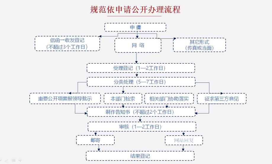 2.辦理期限:行政機關(guān)收到政府信息公開申請,能夠當(dāng)場答復(fù)的,應(yīng)當(dāng)當(dāng)場予以答復(fù)。行政機關(guān)不能當(dāng)場答復(fù)的,應(yīng)當(dāng)自收到申請之日起20個工作日內(nèi)予以答復(fù);如需延長答復(fù)期限的,應(yīng)當(dāng)經(jīng)本行政機關(guān)政府信息公開工作機構(gòu)負(fù)責(zé)人同意,并書面告知申請人,延長答復(fù)的期限最長不得超過20個工作日。